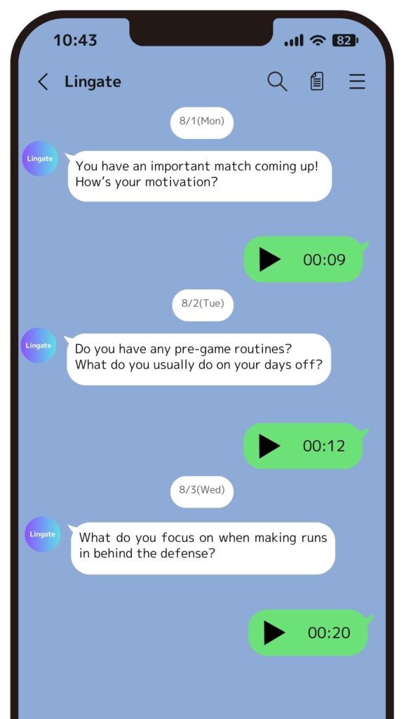 試合やビジネスシーン、旅行などで使えるフレーズや会話力を習得し、瞬時に対応できるスピーキング力を養います。